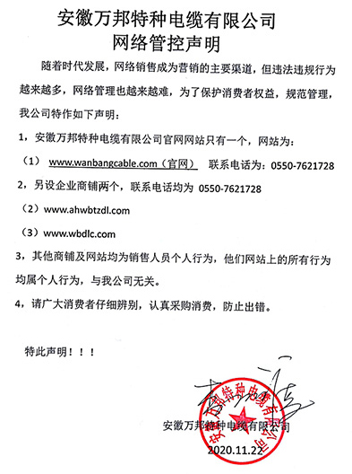 鄭重聲明:安徽萬邦特種電纜有限公司官方網站為:www_wanbangcable_com.bgzb.net.cn,除此之外無任何子網站或合作網站,其余均為假冒偽劣。電話:0550-7621728 13485756353 地 址:安徽省天長市滁州高新技術產業開發區經四路29號